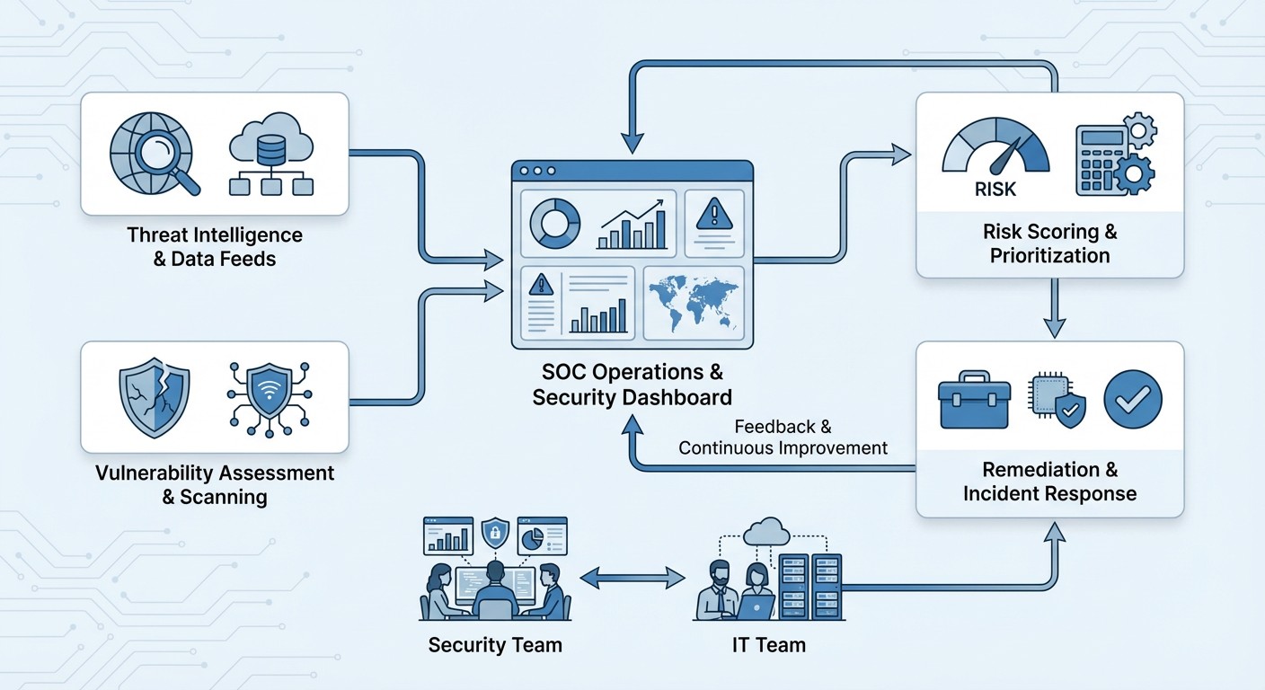 Asset discovery, vulnerability assessment, threat context integration, risk-based prioritization and remediation, and verification/continuous improvement.