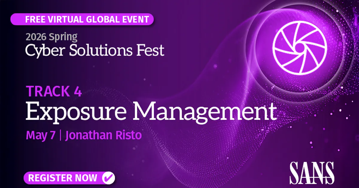 AuthorSANS 2026 Cyber Solutions Fest | Spring Gold Sponsor Threat Exposure ManagementVirtual07 May 2026Learn MoreThis is the default text value
