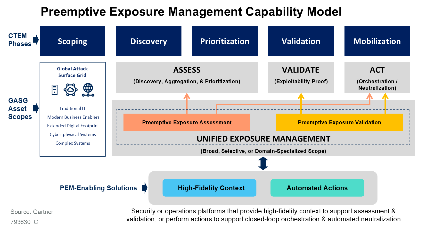 Gartner’s capability model (above) defines the three pillars of preemptive exposure management: