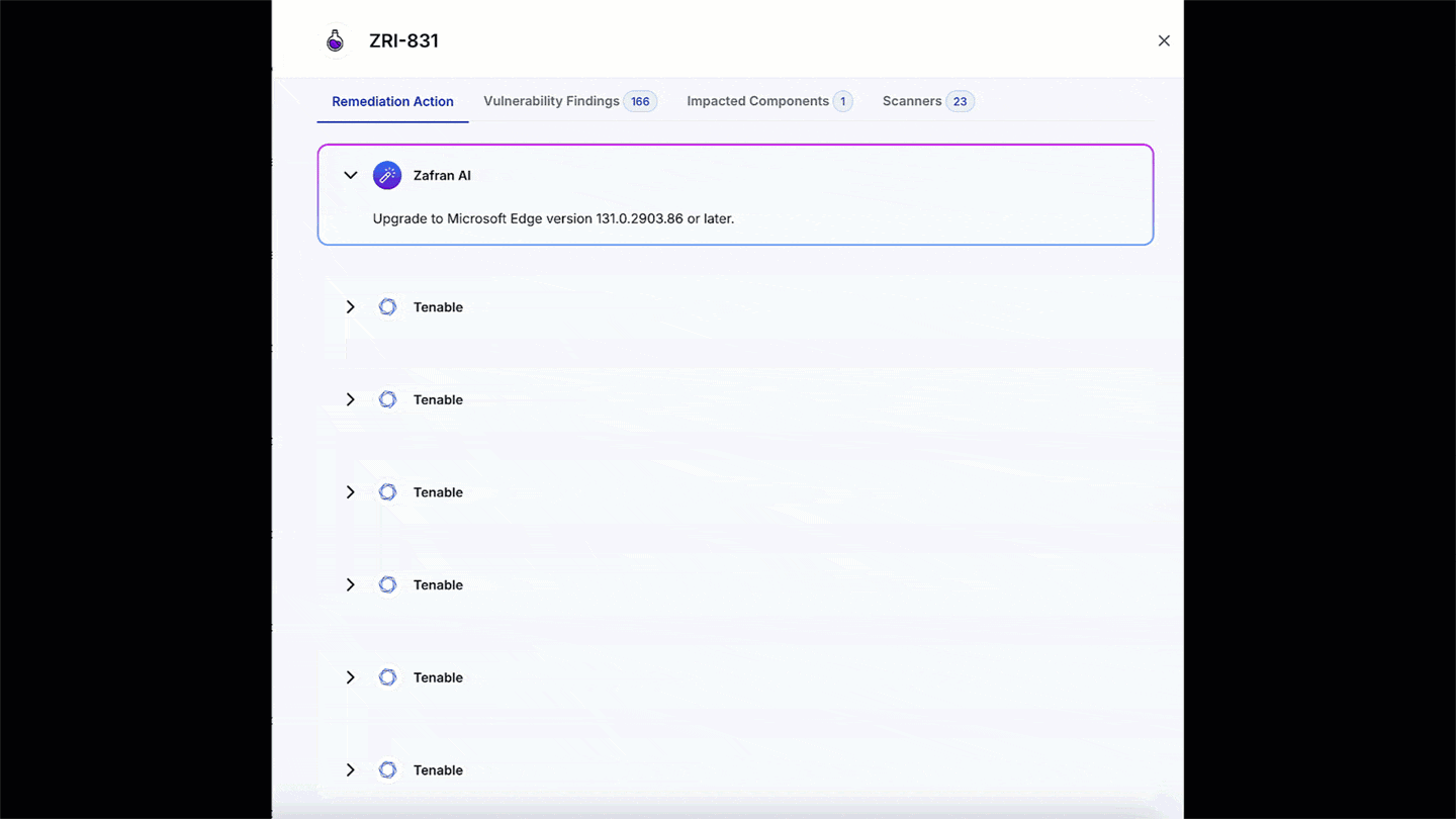 Before Zafran RemOps, a traditional vulnerability remediation process might flood you with dozens of redundant instructions and outdated tickets, often pointing to the wrong solutions. But with the addition of RemOps, the intelligent ghost in the machine makes all that noise go away, lighting the most efficient action plan. The GIF below shows how 166 vulnerabilities in a Microsoft Edge browser can be resolved with a single remediation item. And don’t worry, Zafran keeps all the receipts, showing the user all the original overlapping findings, just in case you want to remind yourself of the pain of The Before Times.